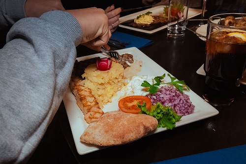 grillad oxfilé, paprika, rödvin, lök, som serveras med tzatziki, ris och hembakat bröd